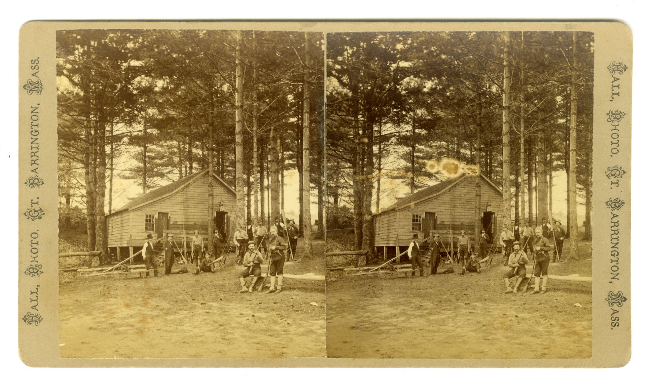 MASS78. Hall, Gt. Barrington, Mass. A view of men in front of a hunting and fishing lodge, lots of guns and poles. Some spots in right image at top of building. G. $35