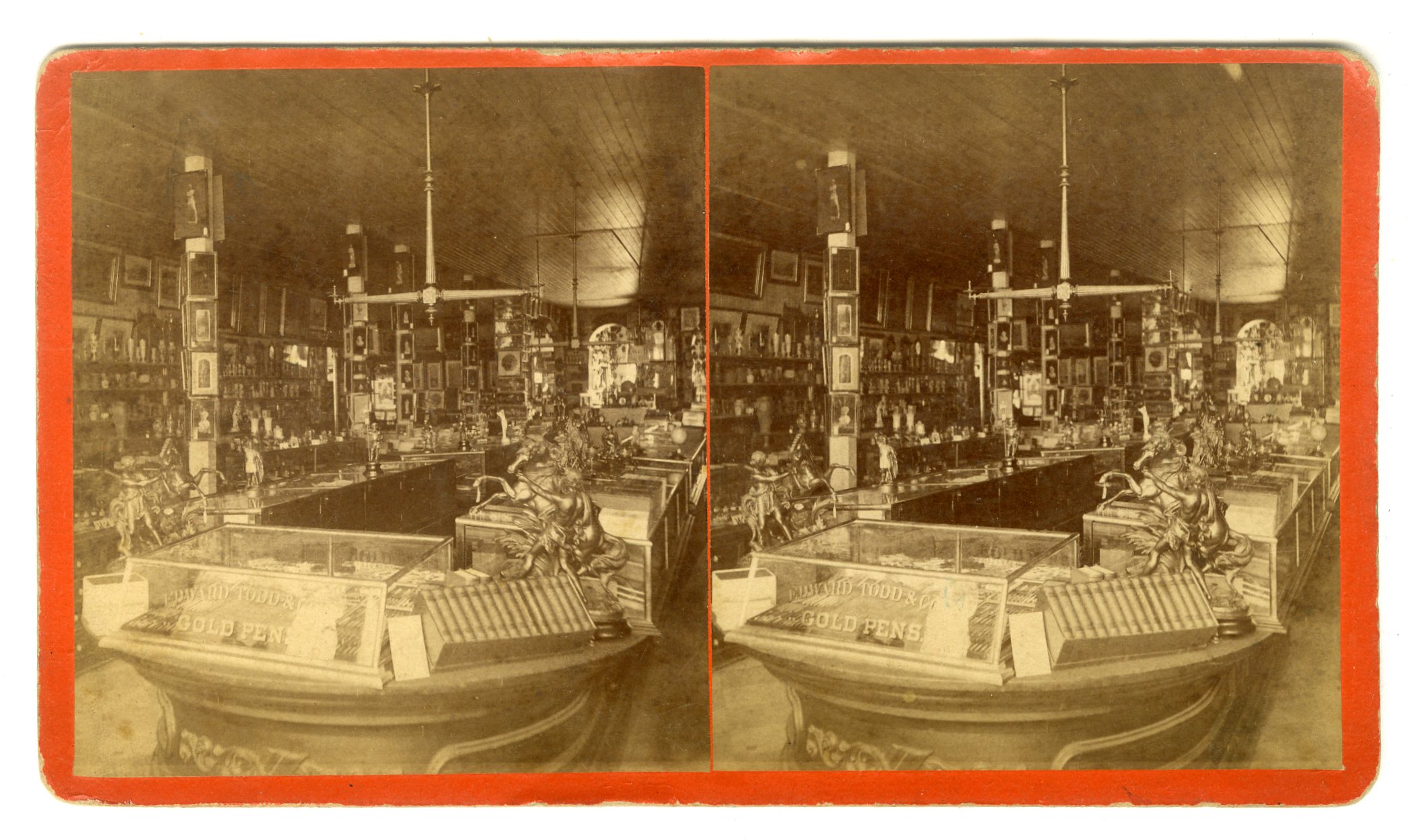 Mass813. “This is a View which one sees on entering Gill’s “Art Store,” Looking down the Southwest side through the Fancy Goods, and towards the Art Department.” Advertising stereoview. VG. $50