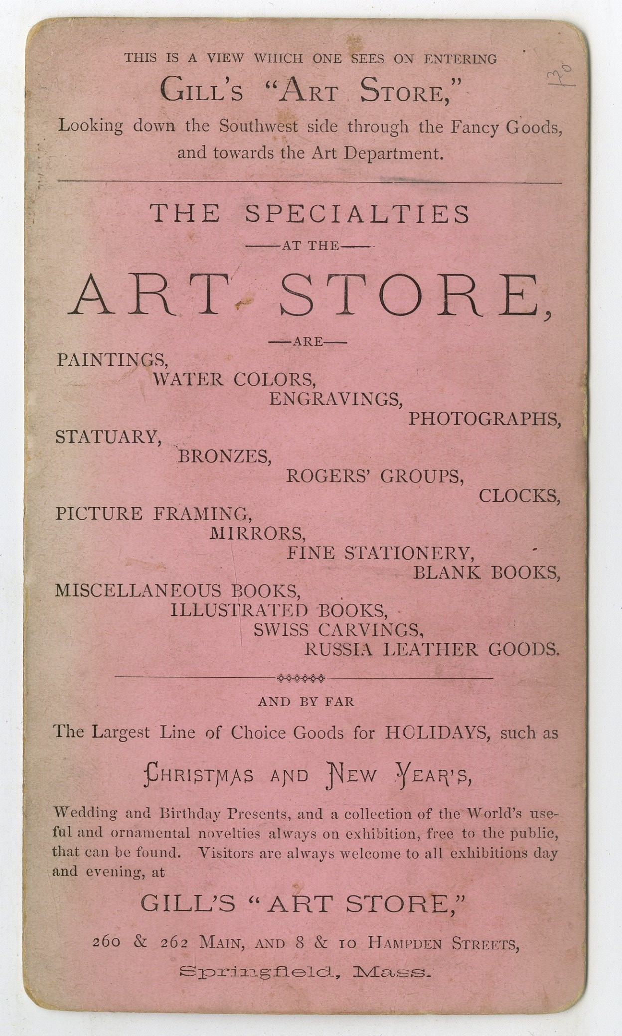 O320. No ID. View of the Picture Window at Gill’s “Art Store.” The Specialties at the Art Store, are Paintings, Water Colors, Engravings, Photographs, Statuary, Bronzes, Rogers’ Groups, Clocks, Picture Framing, Mirrors, Fine Stationery, Blank Books, Miscellaneous Books, Illustrated Books, Swiss Carvings, Russia Leather Goods. Gill’s Art Store, Springfield, Mass. VG. $150