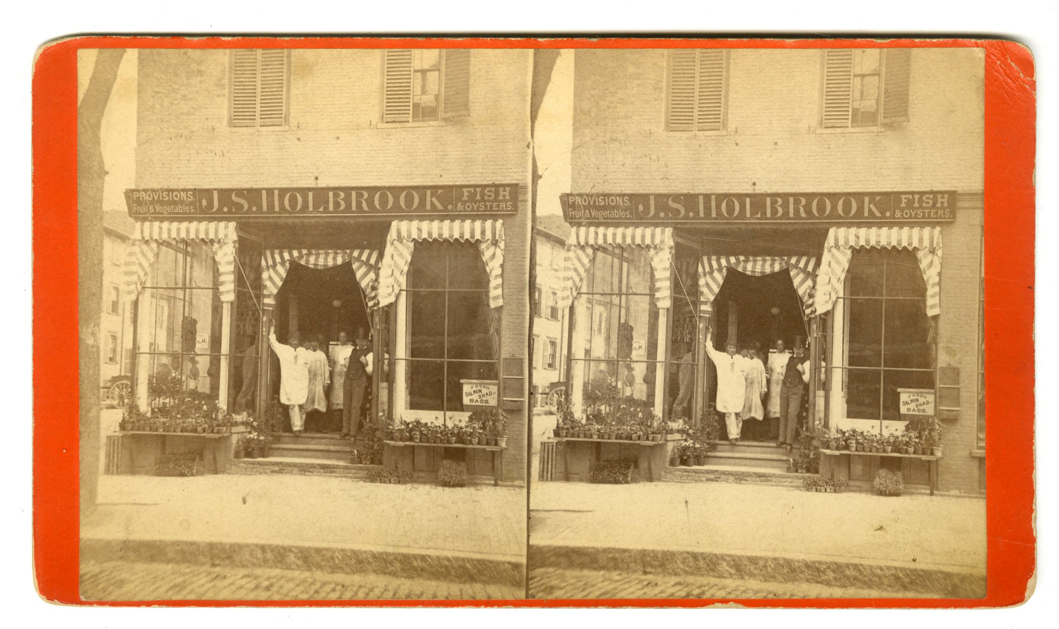 Mass814. Rand & Bird, South Boston. Storefront with workers of J.S. Holbrook, Provision, Fruits & Vegetable, Fish & Oysters. VG. $20