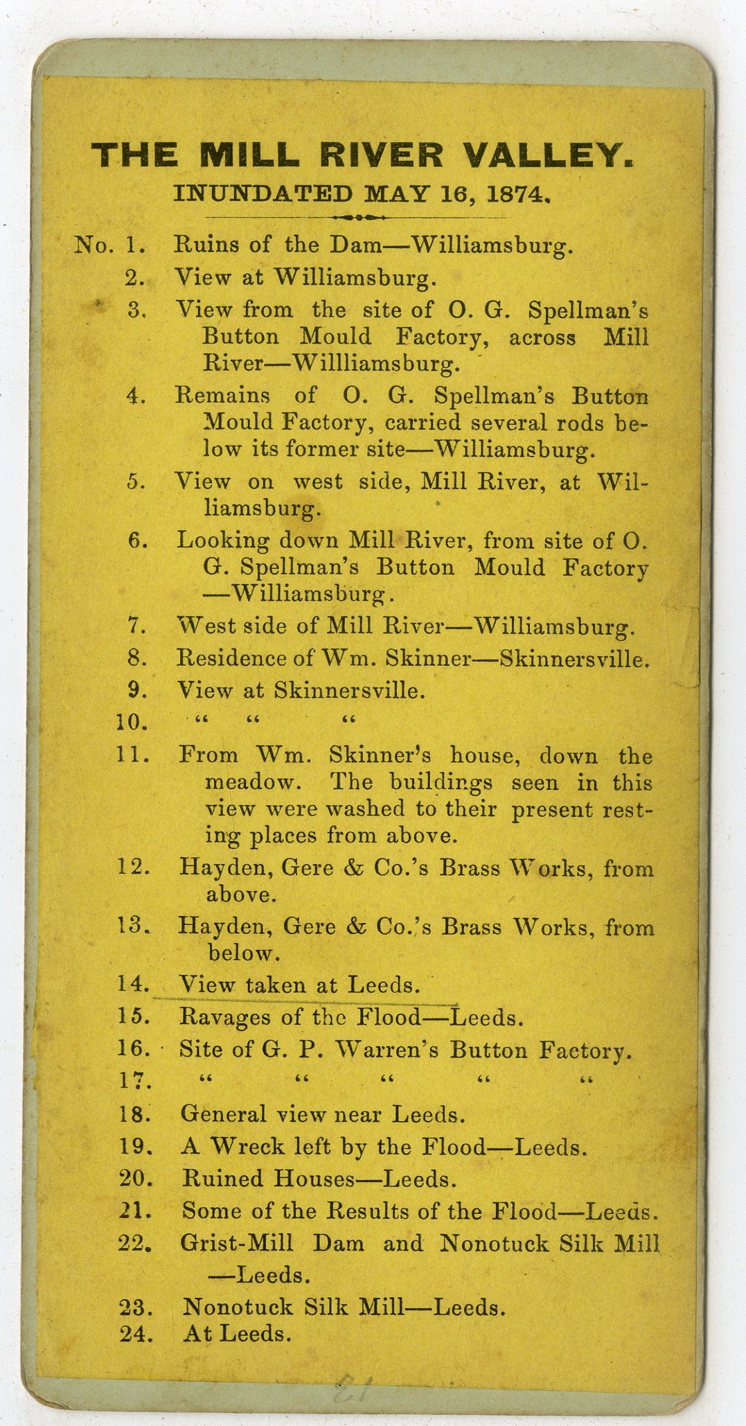 Mass866. C. Seaver, Jr. The Mill River Valley. Inundated May 16, 1874. No. 14. View taken at Leeds. G. $15
