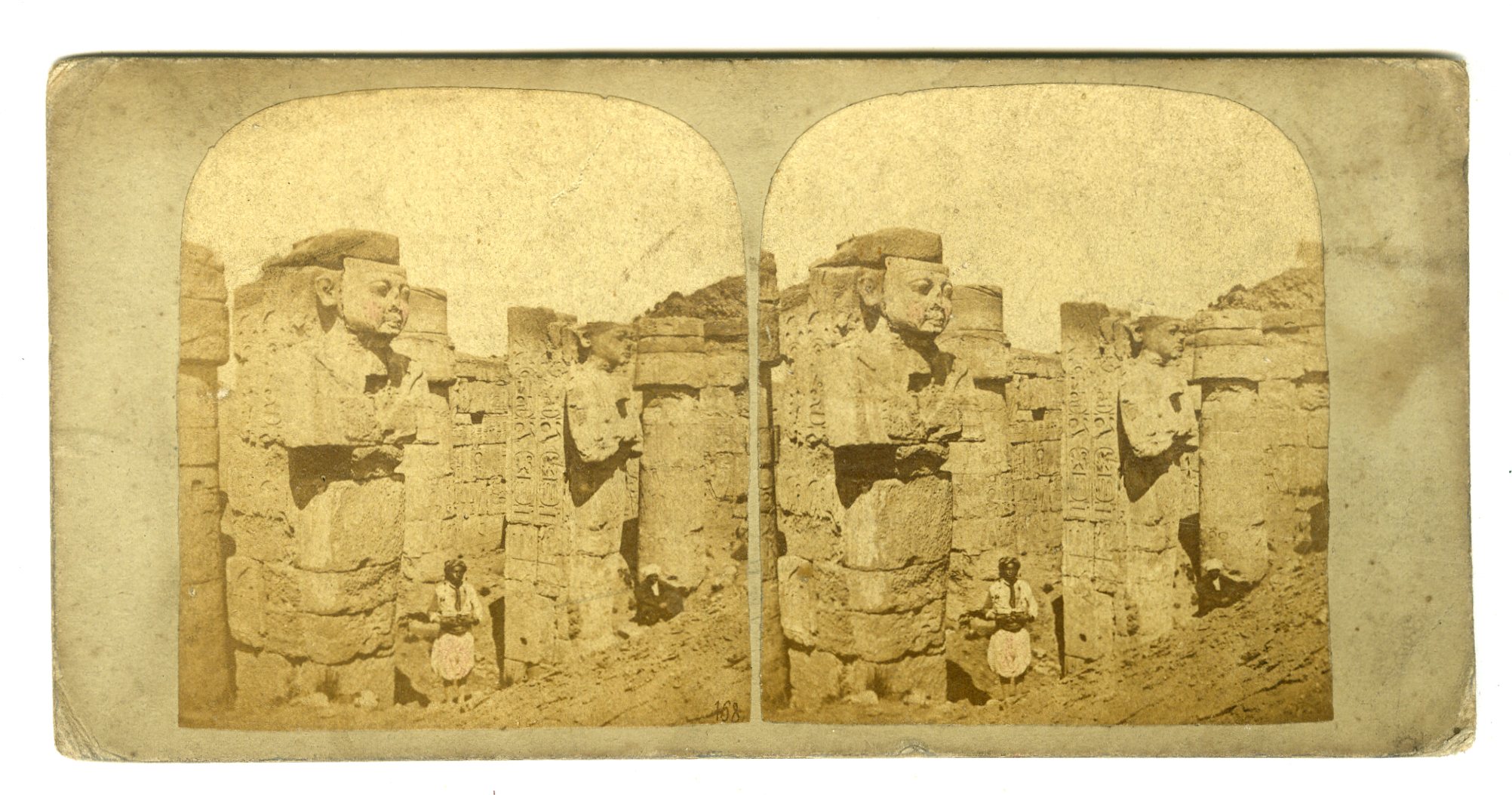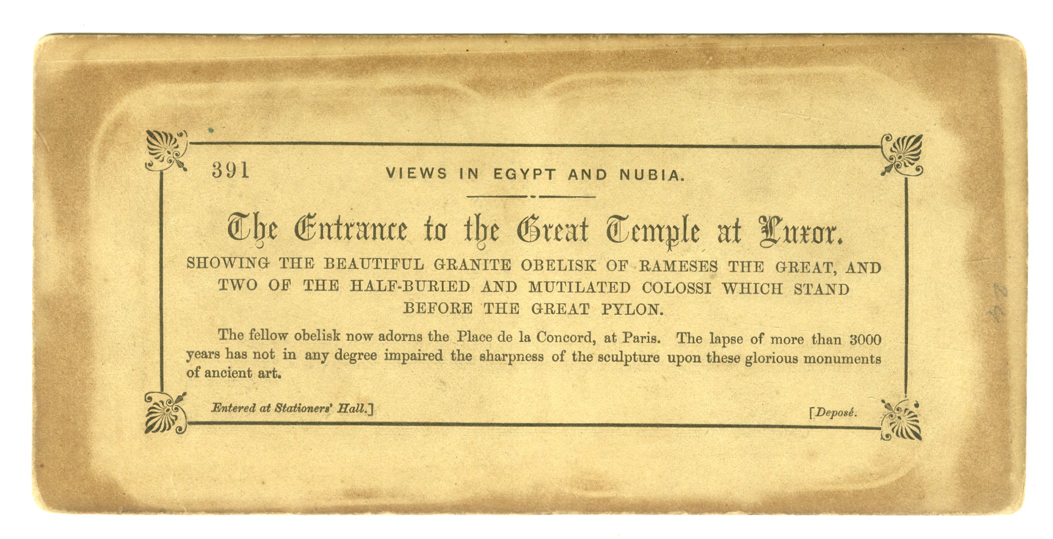 Mideast470. Francis Frith. 394. Views in Egypt and Nubia. The Entrance to the Great Temple of Luxor, showing the beautiful granite obelisk of Rameses the Great, and two of the Half-buried and mutilated colossi which stand before the great pylon. G. $25