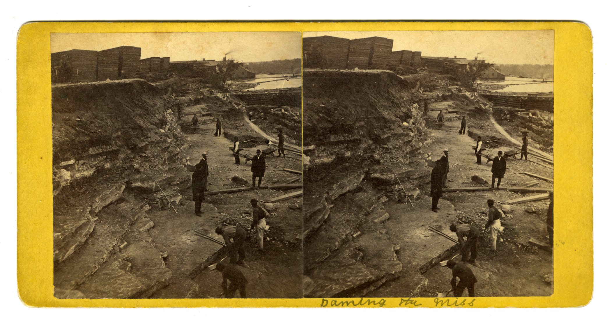 MN231. No. 2. “Bed of Mississippi” tunnel and “aproning” 1870 on St. Anthony side & center. The Eastman tunnel, also called the Hennepin Island tunnel, was a 2,000-foot-long (610 m) underground passage in Saint Anthony, Minnesota, (now Minneapolis) dug beneath the Mississippi River riverbed between 1868 and 1869 to create a tailrace so water-powered business could be located upstream of Saint Anthony Falls on Nicollet Island. The tunnel ran downstream from Nicollet Island, beneath Hennepin Island, and exited below Saint Anthony Falls. During construction of the tunnel on October 5, 1869, the river broke through the thin layer of limestone separating the river’s bed from the tunnel. The rushing river scoured the tunnel, caving in parts of Hennepin Island and causing the earth supporting Saint Anthony Falls to collapse upstream. There was serious concern that the riverbed would crumble and reduce Saint Anthony Falls to a long set of rapids. Within a few weeks, dams were built to divert the river and stop Saint Anthony Falls from being washed away. The fix was temporary as the 1870 spring floods damaged some of the new dams and swept away more of Hennepin Island. The final fix for the tunnel disaster was a concrete dike constructed by the United States Army Corps of Engineers. The Corps also built a protective sloping wood timber apron (which you see in this view) to create an artificial waterfall which remains the only major waterfall on the Mississippi River. E. $250