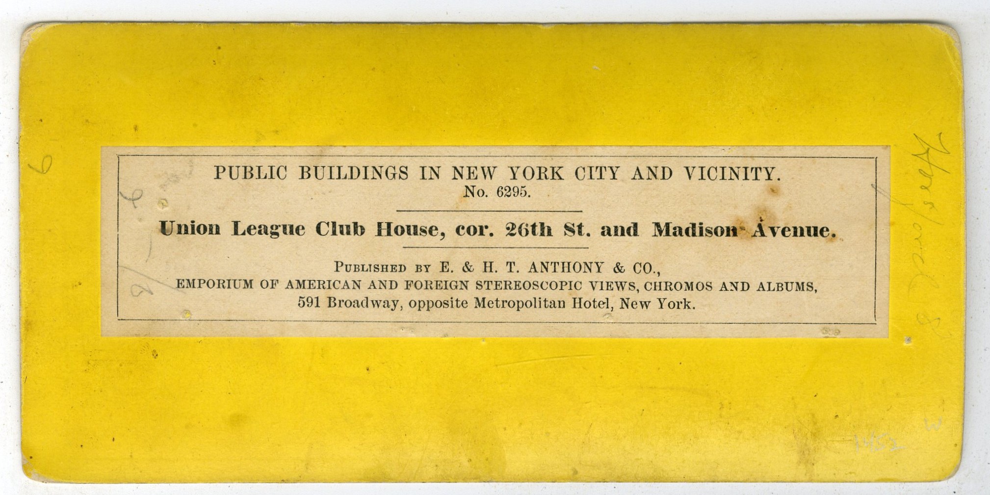 NY909. E&HT Anthony. No. 6295. Union League Club House, cor. 20th St. and Madison Avenue. The Union League was founded in 1863 to support the Union in the Civil War. This is the Union League Club’s second clubhouse, known as the Jerome Mansion, located at East 26th Street and Madison Avenue (across from Madison Square Park), built around 1865 for financier Leonard Jerome, father of Jennie Jerome (Lady Randolph Churchill). This opulent mansion, known for lavish parties, served as the club’s home from about 1868 until the club moved to its current Park Avenue location, with the mansion later demolished. The League is still operating as a private club in NYC. G. $20