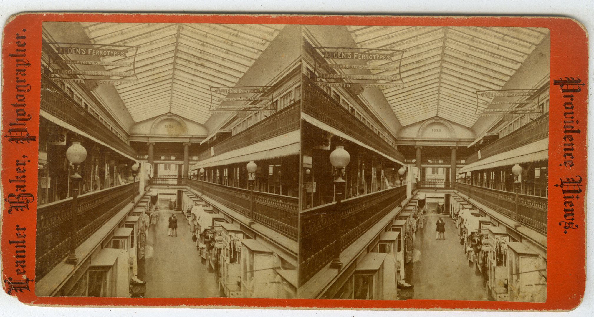 PH238. Leander Baker, Providence Views. Arcade. There are two signs for Alden’s Photographic Studio, Alden’s Ferrotypes, hanging on each side. G. $35