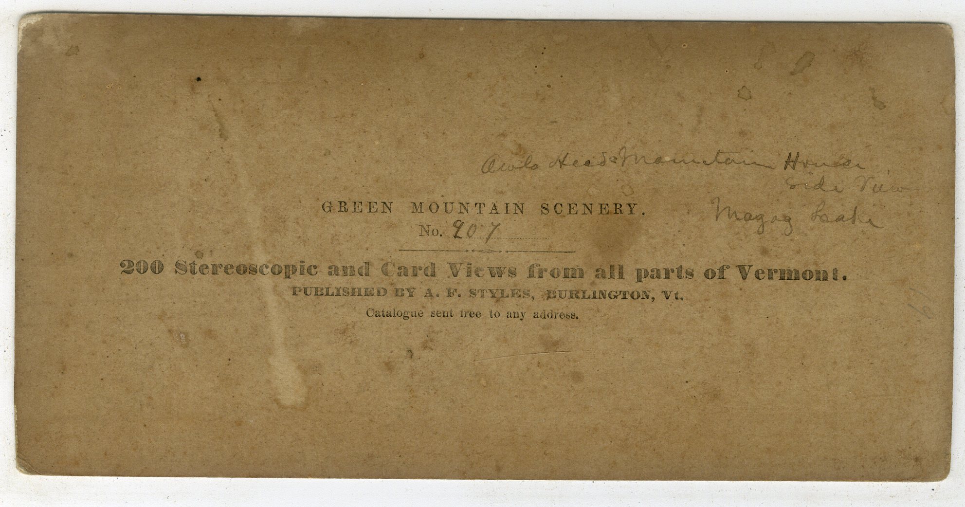 VT270. A.F. Styles, Burlington, Vt. Green Mountain Scenery. No. 207. Owls Head Mountain House, side view, Magog Lake. G. $20